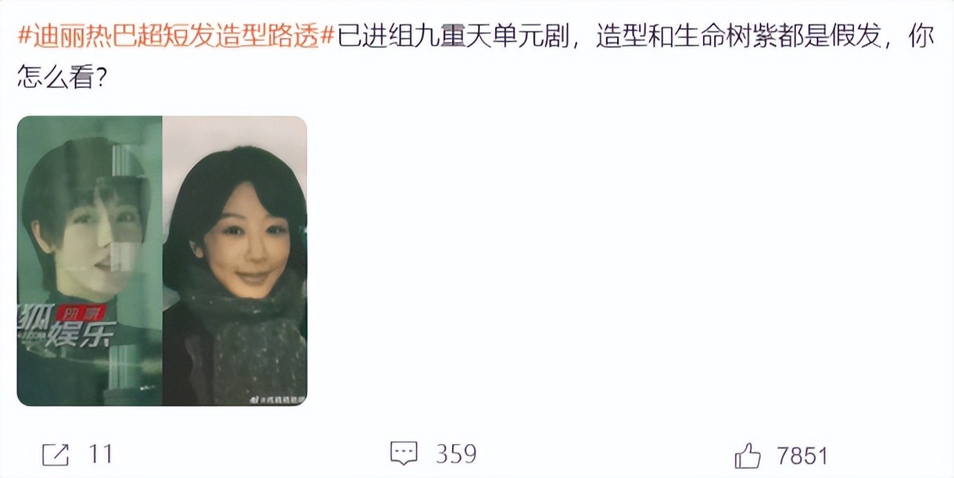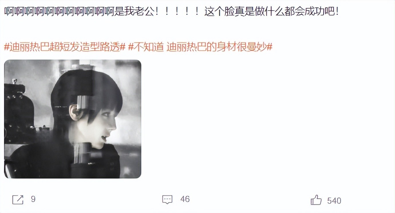 对于演员来说,适当地改变造型,确实可以给观众们带来新鲜感,当迪丽热巴短发路透出现后,相关话题瞬间登上热搜,很多网友都表示:非常期待《九重天》。