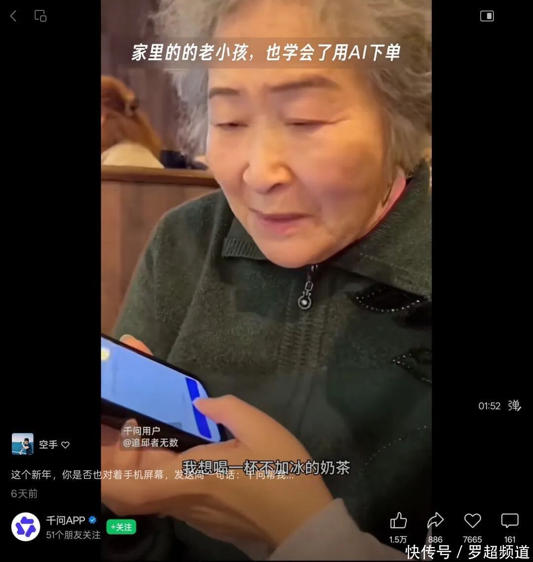 它最典型的应用场景,比如全家人一起去看电影,让千问一键买票;亲友聚会让千问一句话点奶茶咖啡;家里来客人,让千问生成菜谱并直接下单买菜。另外,千问还借助家庭欢聚场景,让年轻人教父母长辈如何用千问下单,教爷爷奶奶点一杯不加冰的奶茶、买一张电影票,这有效影响了下深市场。