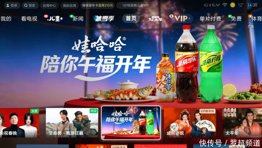 所以,娃哈哈在这两年春节期间投放了很多大屏广告,确保消费者打开电视就能看到。包括开机必现的开屏广告,还有在小米电视、海信电视上打造的娃哈哈“春晚特开频道”。只要消费者看春晚,不管是央视春晚还是北京卫视、东方卫视等地方卫视春晚,都能第一时间看到娃哈哈。而且春晚期间,用户还会收到娃哈哈的新年倒计时贺岁提醒。