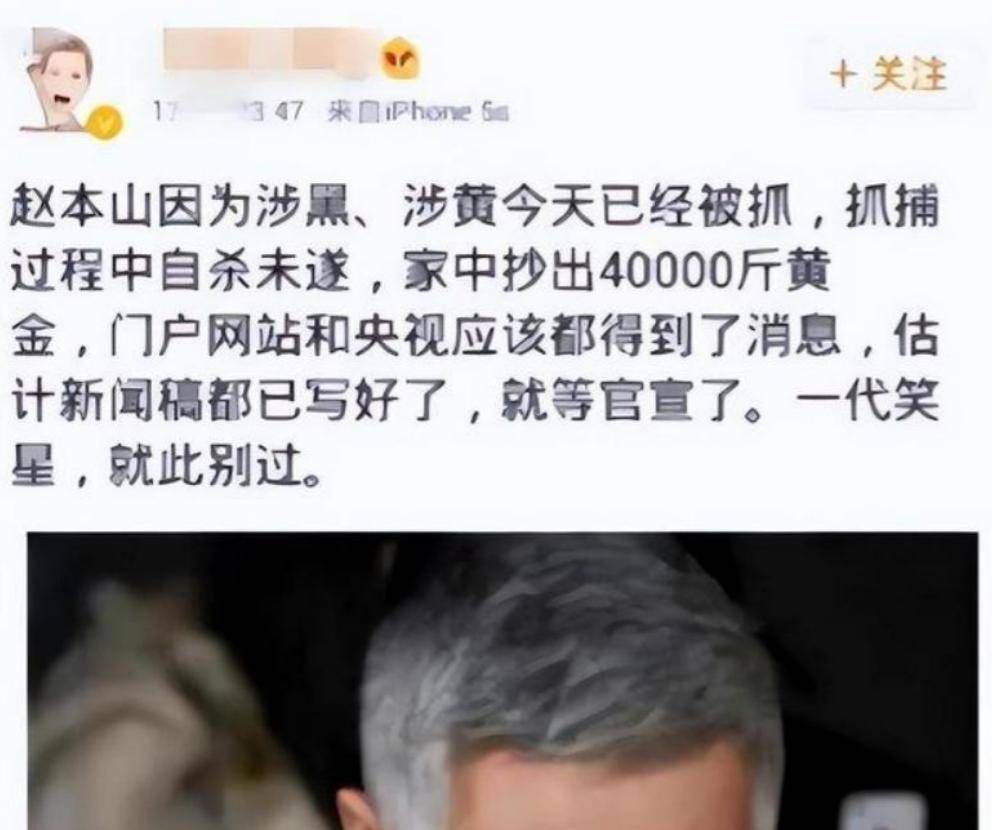 2014年年底,网络上突然炸开一条消息:赵本山被抓了,家里搜出20吨黄金,价值高达40亿人民币。更有人添油加醋,编造出"自杀未遂"等细节,一时间谣言传得沸沸扬扬。当时赵本山的徒弟大鹏忍不住在社交平台开怼:"我就问一句,咱国家法律管不管造谣?!"